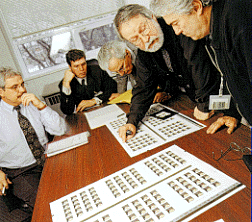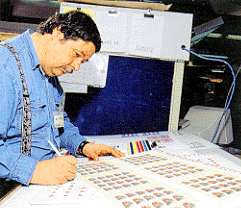 Creating a stampThe design, printing and finishing of a stamp is a collaborative process starting with the research, begins Bill Danard, design manager, Stamp Products. We want to know the subject thoroughly to determine what should be shown on the stamp and what visual material is available. With input from both marketing and design managers, refined designs are prepared for presentation to the Advisory Committee.During the design process the designer, design manager, film and colour experts, and printers consult about the size of the stamp, number of colours, paper stock, printing and finishing techniques. We use a variety of printing methods, lithography (offset) in up to nine colours, intaglio (engraving), or a combination of lithography and intaglio together with foil stamping and embossing. When the design work has been completed, we take the drawing, painting, photography, illustration or, most common now, cornputer-generated electronic artwork to the film house. There the electronic files are manipulated, colour separation films produced, printing plates developed and full colour proofs made. One unique production element, now being copied by other stamp-producing countries, is our use of stochastic screening on the film, giving us a much higher resolution. Before the printer goes on press for the production run, the stamp image is viewed at a number of proof stages to allow for colour corrections and adjustments and a process known as wet trap proving to replicate the approved ink image under production conditions. About 5000 press sheets are pulled at this stage, proofed and left to dry for 24 hours before the designer and design manager sign off on six sheets, retained for archival purposes. The remainder are destroyed.