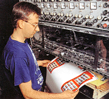 Stamp finishing is the next stage. Perforation combs determine the size and proportions of stamps and can cost up to 35 000 Canadian dollars each. That's why perforation influences the original design, Danard elaborates. After perforation the press sheets go to the guillotine for specialized cutting. As part of the finishing process all stamps are inspected for flaws and defective work culled out. Stamps are designated as field stock meeting acceptable industry and operational standards - or as philatelic stock, which is inspected to a higher level and is trimmed differently. The finished products are packaged for shipping to Canada Post's National Philatelic Centre and to retail service centres, from where they are shipped to standing offer customers and to retail sales outlets. All printing waste and defective stamps are security-destroyed, witnessed and recorded, because stamps have a monetary value. The printers also have financial accountability for the product, concludes Danard. (Acknowlcdgment: Margaret Chartrand, Performance: Canada Post Corporation) |