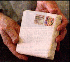 ![]() Hands holding one of 28 small packages containing bombs found in Australia. All the packages were franked with the same two stamps and mailed from Canberra. |