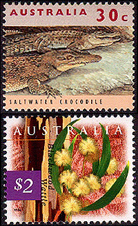 ![]() Mint copies of the two stamps that were used to frank mail bombs in Australia. The stamps are the 30¢ Saltwater Crocodile and the $2 Blackwood Wattle Flower. |