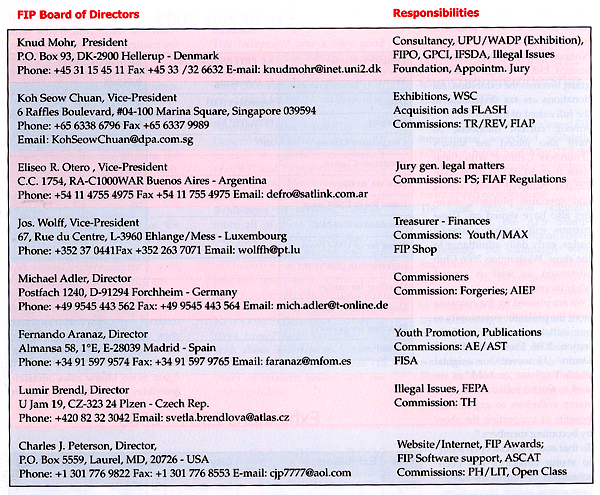 Besides the Board, the FIP has eleven Commissions / Sections, each headed by a President/Leader and a bureau of six members. Each Commission/Section looks after a specialised fields of the hobby: Aerophilately, Astrophilately, Prevention and Detection of Forgeries, Maximaphily, Philatelic Literature, Postal History, Postal Stationery, Thematic Philately, Traditional Philately and Youth Philately.