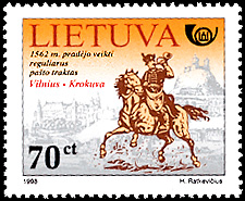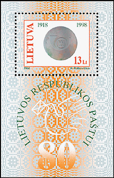 On Feb. 16, 1918, Lithuania declared its independence from Russia. The Lithuanian postal administration was founded Nov. 16 of that year. The hologram stamp honors the 80th anniversary of Lithuania's postal administration. The hologram part of the stamp features the post horn emblem of Lithuania's postal service (Lietuvos Pastas). The stamp is denominated 13 litas. In addition to the hologram it includes the year dates "1918" and "1998." The latter year date also appears at the bottom of the design, along with the name of the designer of the stamp, H. Ratkevicius. The stamp is by itself in a souvenir sheet. The border area of the sheet includes an inscription marking the 80th anniversary and a symbolic dove carrying a letter. The Hungarian state securities printing office in Budapest printed 60,000 copies of the souvenir sheet by offset. In this printing process, an inked image is transferred from a plate to an intermediate cylinder, which prints it on the paper. Lietuvos Pastas related some of its early history in the press release announcing the stamp. According to Lietuvos Pastas, the first Lithuanian stamps were issued Dec. 25, 1918, in Vilnius (the capital). The announcement says: "They [the stamps] were printed during one night on thick yellowish paper. "The stamps had neither watermarks nor glue on them. The stamps of the two values -- 10 and 15 skatikai -- were printed in 5,000 copies each." Lithuania also released another stamp in its Postal History series Oct. 9. This 70-centai stamp salutes the establishment of centralized postal communications between Lithuania and western Europe in the 16th century.